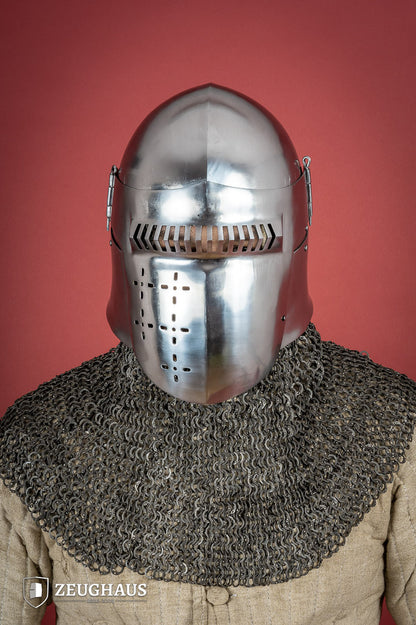 In the 14th and 15th centuries, bascinets had become a mainstay among warriors who sought to protect themselves on the battlefield. This particular model is based on numerous artistic works that date back to the beginning of the 14th century - an exquisite fusion between defense and vision with its pyramidal grille system in its visor design. The foldable construction can be easily removed using a simple pin-system for maximum utility during battle.